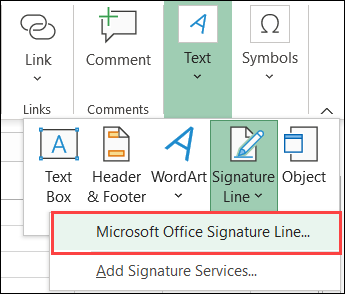 转到“插入”选项卡,然后在功能区的右侧,单击“文本”。在下拉框中,选择“签名行”,然后选择“ Microsoft Office签名行”。