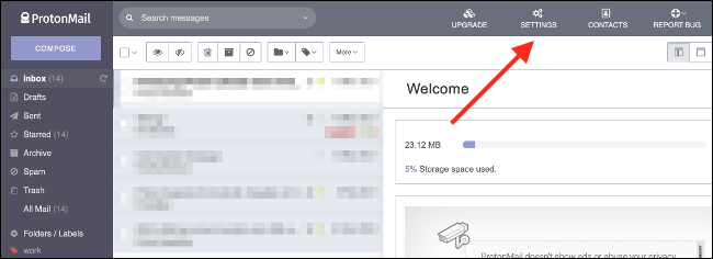 要永久删除您的ProtonMail帐户,请首先使用您的用户名和密码登录,然后单击屏幕顶部的“设置”选项卡。