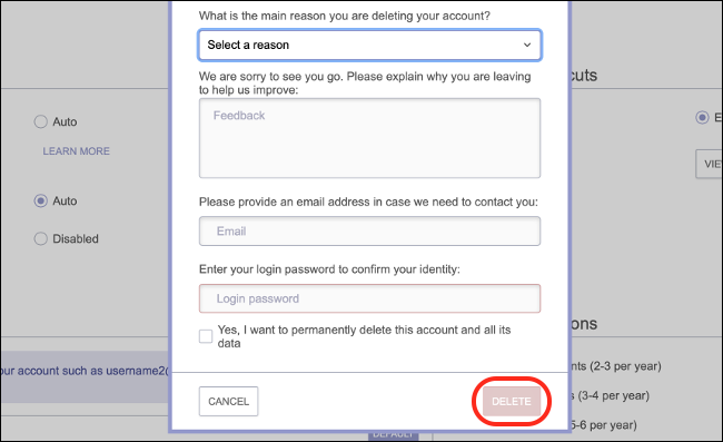 您将到达屏幕左侧边栏中的“帐户”标签。一直向下滚动到“删除帐户”部分,然后单击“删除帐户”按钮。