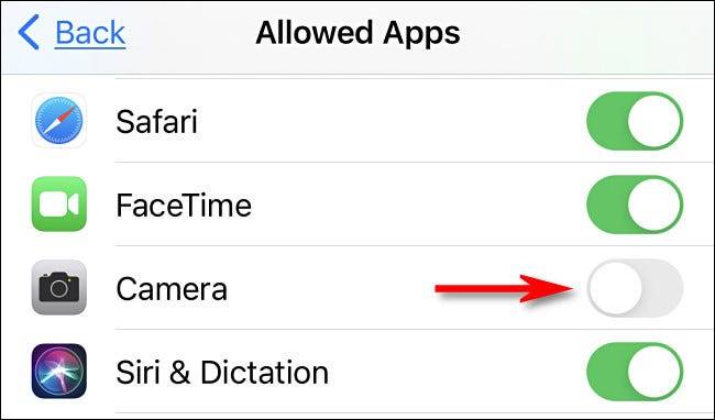 在“允许的应用”中,翻转“相机”旁边的开关以将其“关闭”。