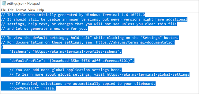 退出Windows终端,然后重新打开。该应用程序将注意到您的设置文件为空,并会自动使用默认值创建设置文件。