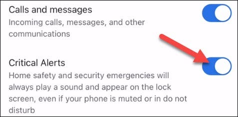 您会看到Google Home应用可以提供的几种不同类型的通知。您需要启用的一个是“严重警报”。