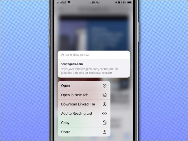 当您长按所有前进的链接时,将显示网站预览弹出窗口。