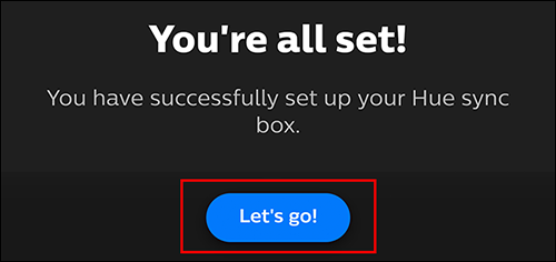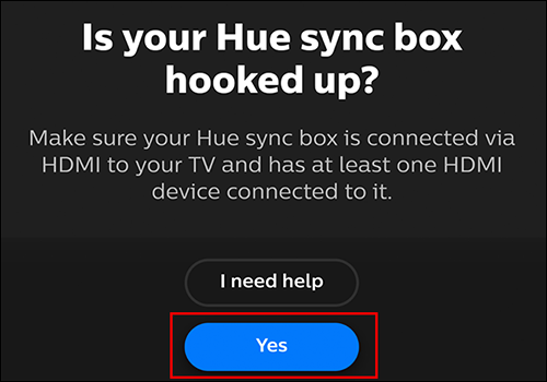 然后,该应用程序将询问您是否设置了“色相同步盒”。为此,只需将同步盒插入电源,确保已插入您要使用的所有HDMI输入,然后确保同步盒已通过HDMI插入电视。完成所有步骤后,点击“是”。