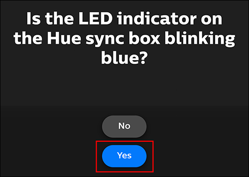 如果设置正确,则色相同步盒的前部LED应当闪烁蓝色。如果是,请点击“是”。如果它以不同的颜色闪烁,请选择“否”,该应用程序将指导您完成一些故障排除步骤。