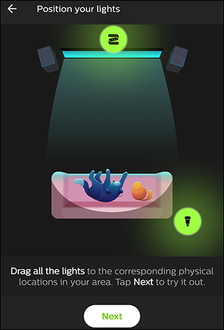 确定您的灯光将位于的位置。点按并将灯光拖到房间中的正确区域。在此示例中,我将飞利浦Hue Lightstrip放置在电视后面,而灯则在沙发的右边。完成后,点击“下一步”。