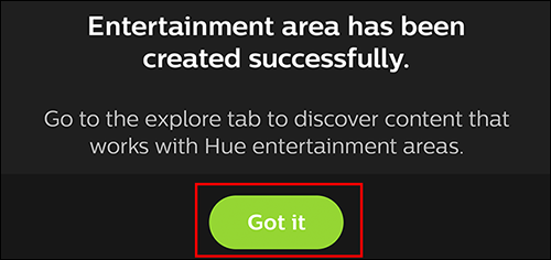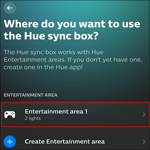 接下来,该应用程序将询问您要在哪个房间或娱乐区中设置“同步框”。如果您在Philips Hue应用程序中已经设置了娱乐区,则只需选择它即可。如果没有,请点击“创建娱乐区”。