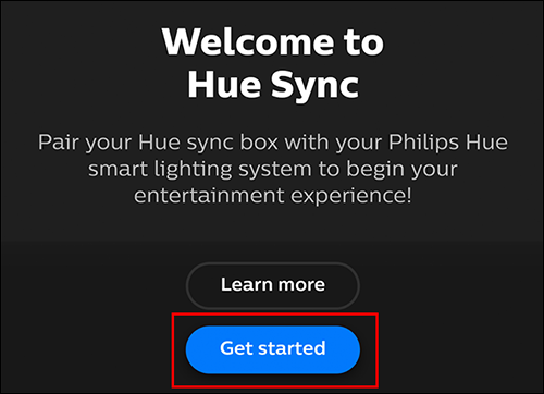 首先,为您的iPhone,iPad或Android设备下载Hue Sync应用程序。请记住,这与常规的Philips Hue应用程序不同。首次打开该应用程序后,会出现一个欢迎屏幕。选择“入门”。