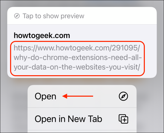与Mac不同,iPhone和iPad上的Safari没有状态栏。但这确实使您可以浏览要打开的页面。您可以点击并按住任意链接以在弹出预览窗口中加载页面。如果您不喜欢完整预览,则可以切换为仅查看URL(如Mac上的Safari)。
