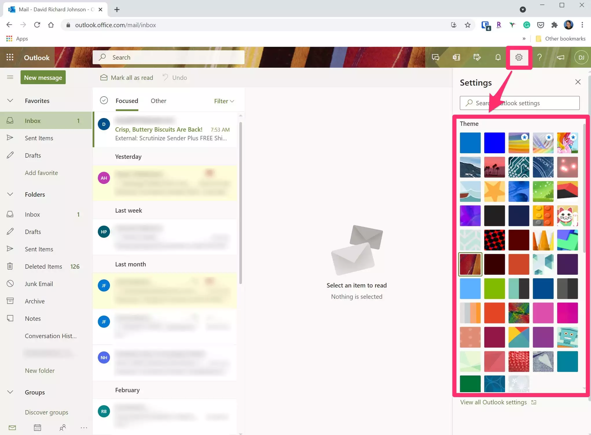 - 更改主题。想要Outlook的其他主题吗?单击页面右上方的“设置”图标(形状像齿轮),然后从“设置”窗格的顶部选择一个主题。可用的主题比您在这里看到的要多-单击“查看全部”以查看更多主题。