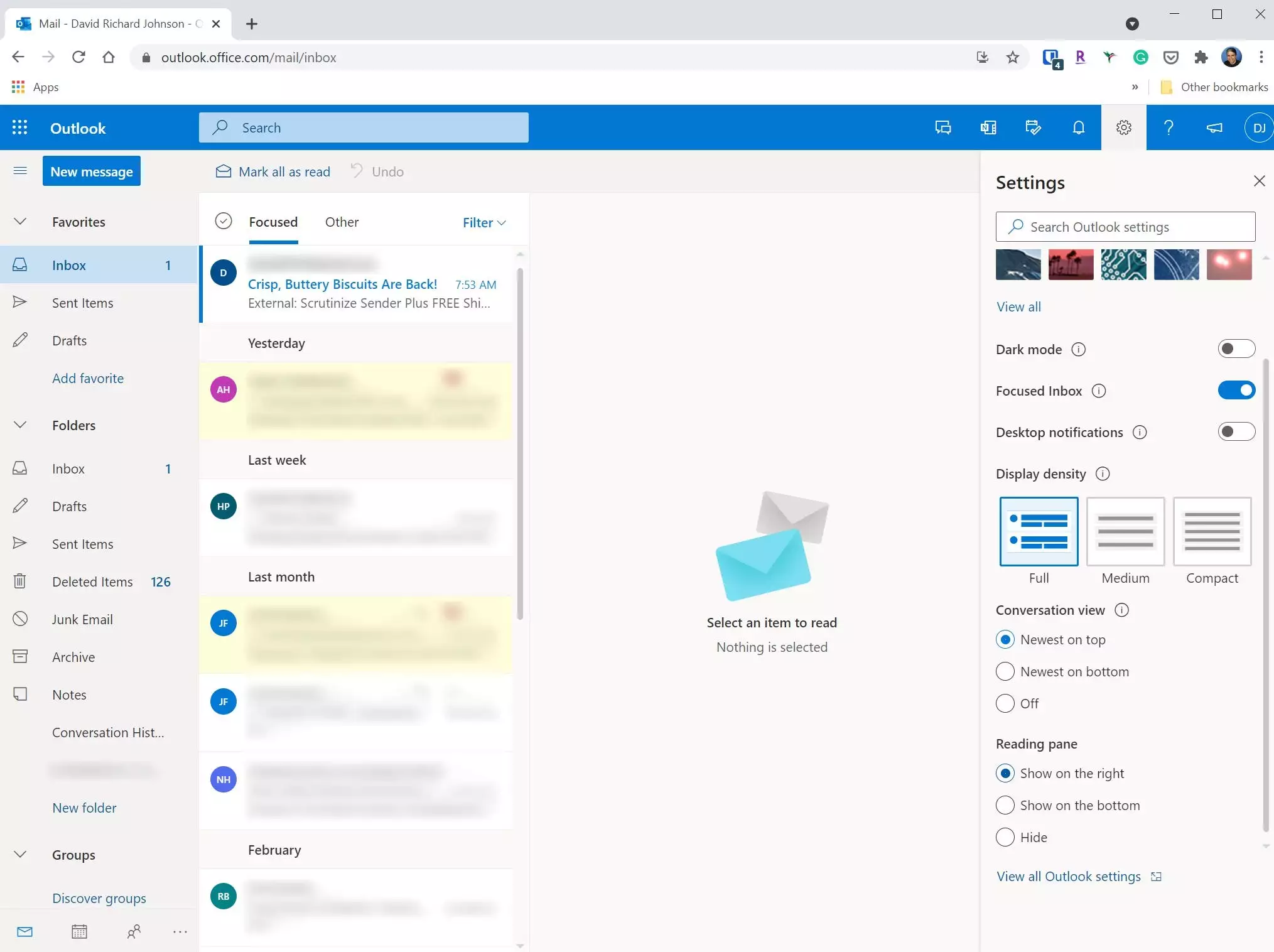 - 配置阅读窗格。您可以将“阅读”窗格设置为显示在消息窗格的右侧(默认设置),位于消息窗格的下方,甚至可以完全禁用它。单击页面右上方的“设置”图标(形状像齿轮),然后在页面底部的“阅读窗格”部分中,选择“在右侧显示”,“在底部显示”或“隐藏” 。” 如果您选择隐藏窗格,则当您单击邮件列表中的邮件时,邮件将显示在新窗口中并接管Outlook网页。