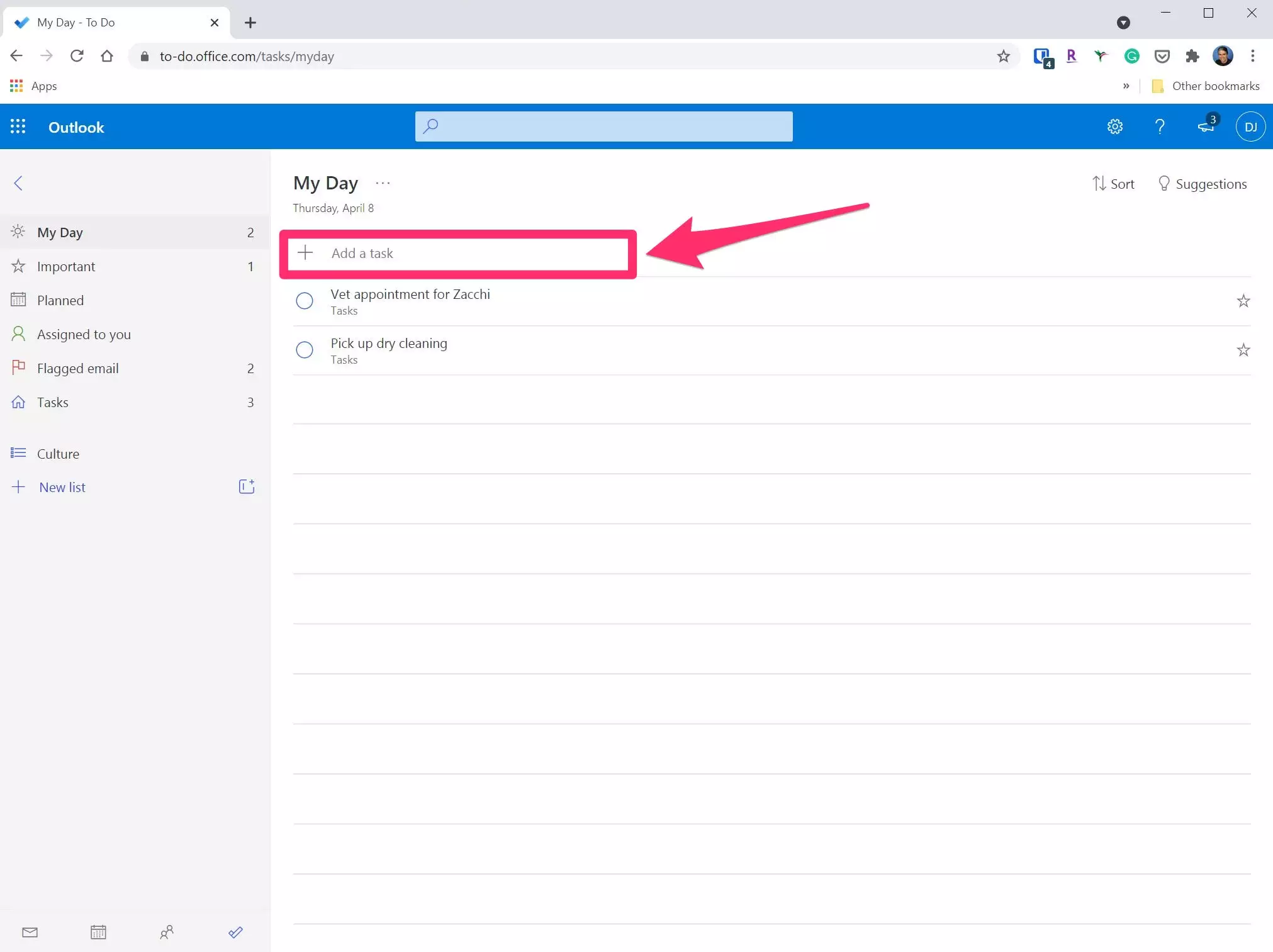 “待办事项”页面在页面左侧具有一个任务列表窗格,在右侧具有任务列表。要创建任务,请单击要在其中显示任务的列表。然后,在右侧的任务窗格中,单击加号右侧的并键入您要执行的操作。您可以通过在“重要”列表中创建任务或在创建任务后单击星号来标记任务。