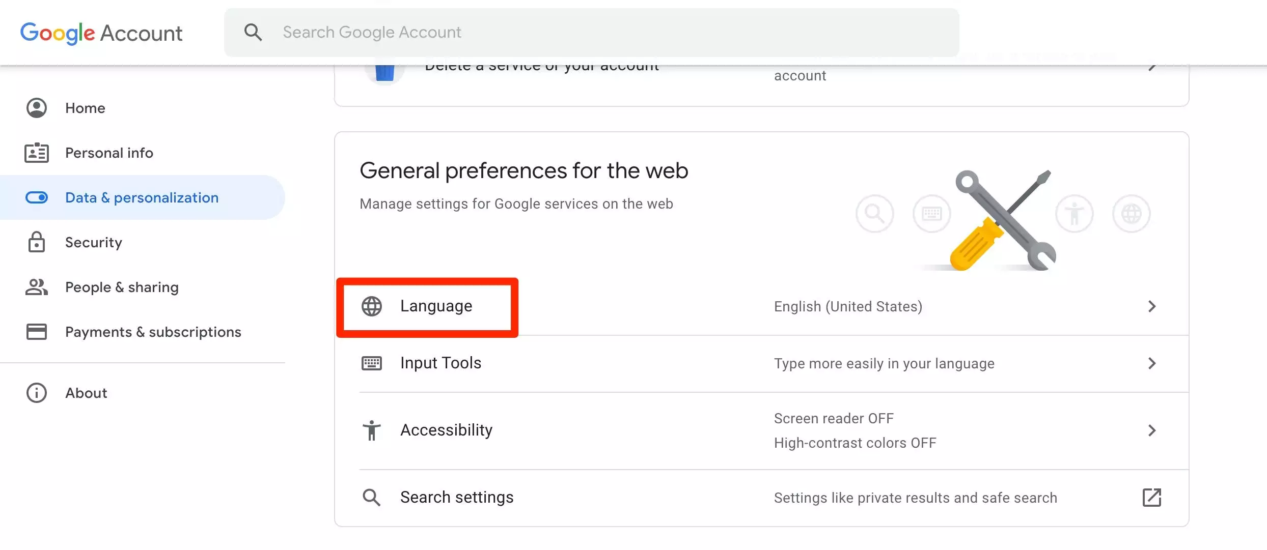 要更改Android上Google服务和网页翻译的语言,您首先需要打开“设置”应用,然后从选项列表中选择Google。在您的帐户个人资料上,点击电子邮件和个人资料图标下的“管理您的Google帐户”。最后,从顶部栏中选择“数据和个性化”选项。