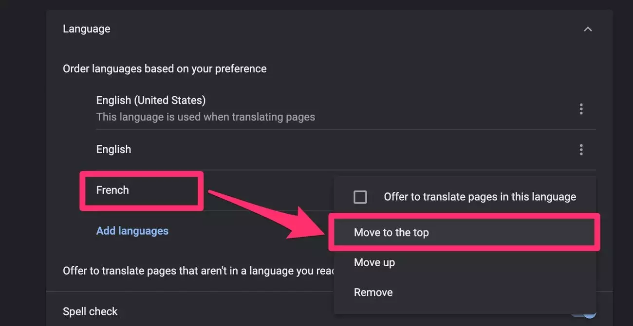 7.单击首选语言名称右侧的三个垂直点,然后选择“移至顶部”以将该语言赋予最高优先级。