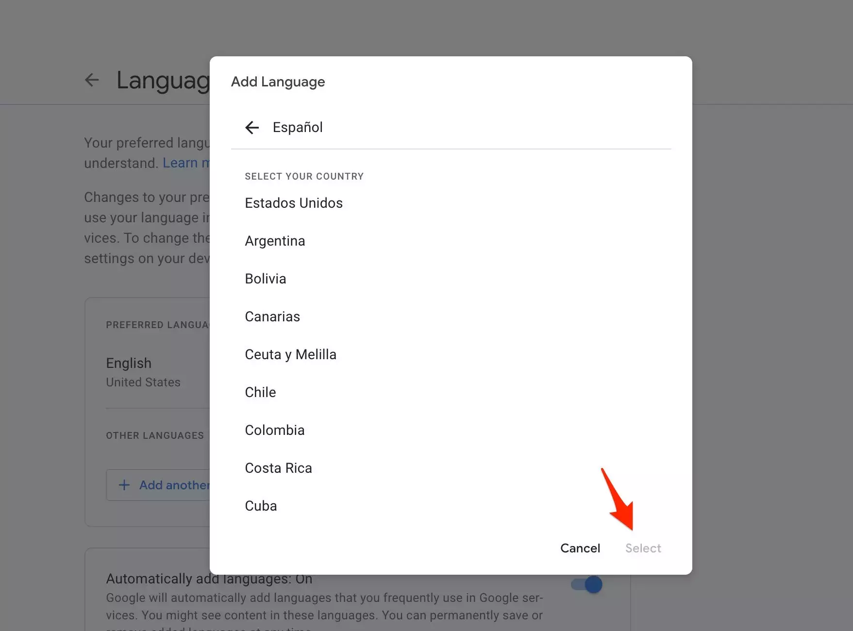 5.输入您想要设置的语言或滚动直到找到它,然后单击“选择”。