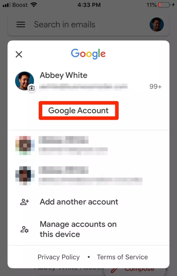 在iPhone上,访问您帐户的帐户要容易得多 语言设定。只需打开邮箱应用程序,点击您的个人资料图片或右上角的缩写,然后选择“ Google帐户”。您应该可以从这里访问您的数据和个性化设置。