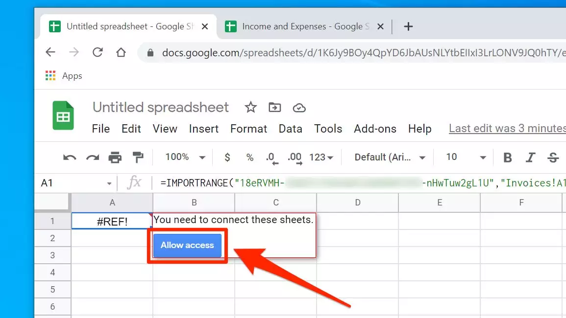 8.但是,您可能已经注意到数据没有导入-有一个#REF!单元格中的错误。单击此单元格,您将看到一条消息,需要连接这些工作表。单击“允许访问”,然后过一会儿,数据将出现。您只需为导入数据的每个电子表格执行一次。