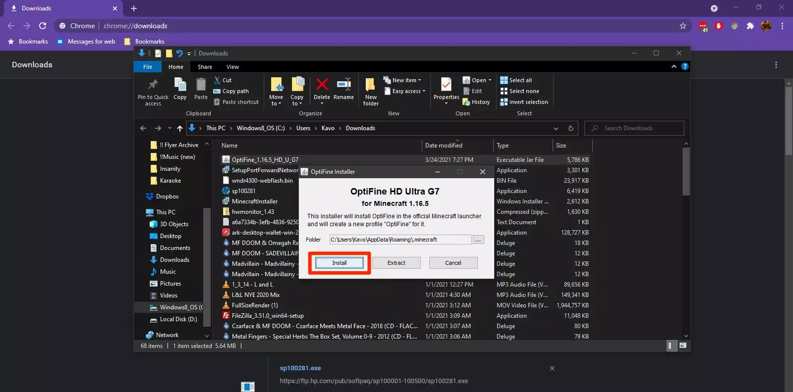 2.找到您下载的.jar文件,然后双击它以运行安装程序。点击“安装”。之后,您应该会看到一条消息,宣布OptiFine成功安装。