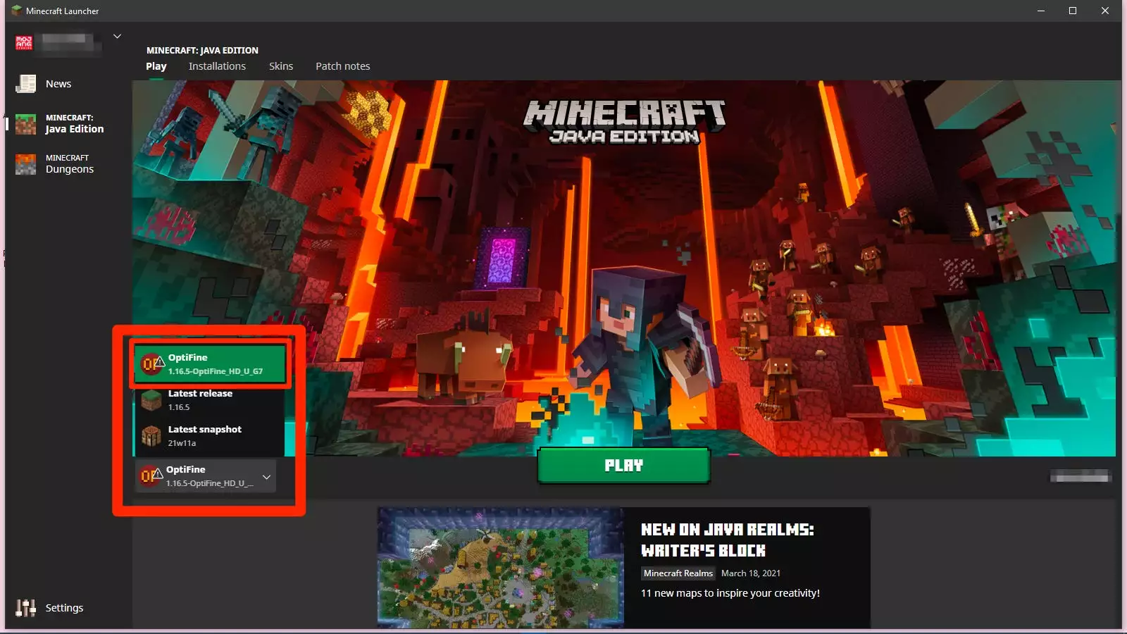 3.打开Minecraft Launcher应用程序。在“播放”按钮左侧的下拉菜单中,选择OptiFine(如果要运行其他Mod,则选择“伪造”),然后单击“播放”。