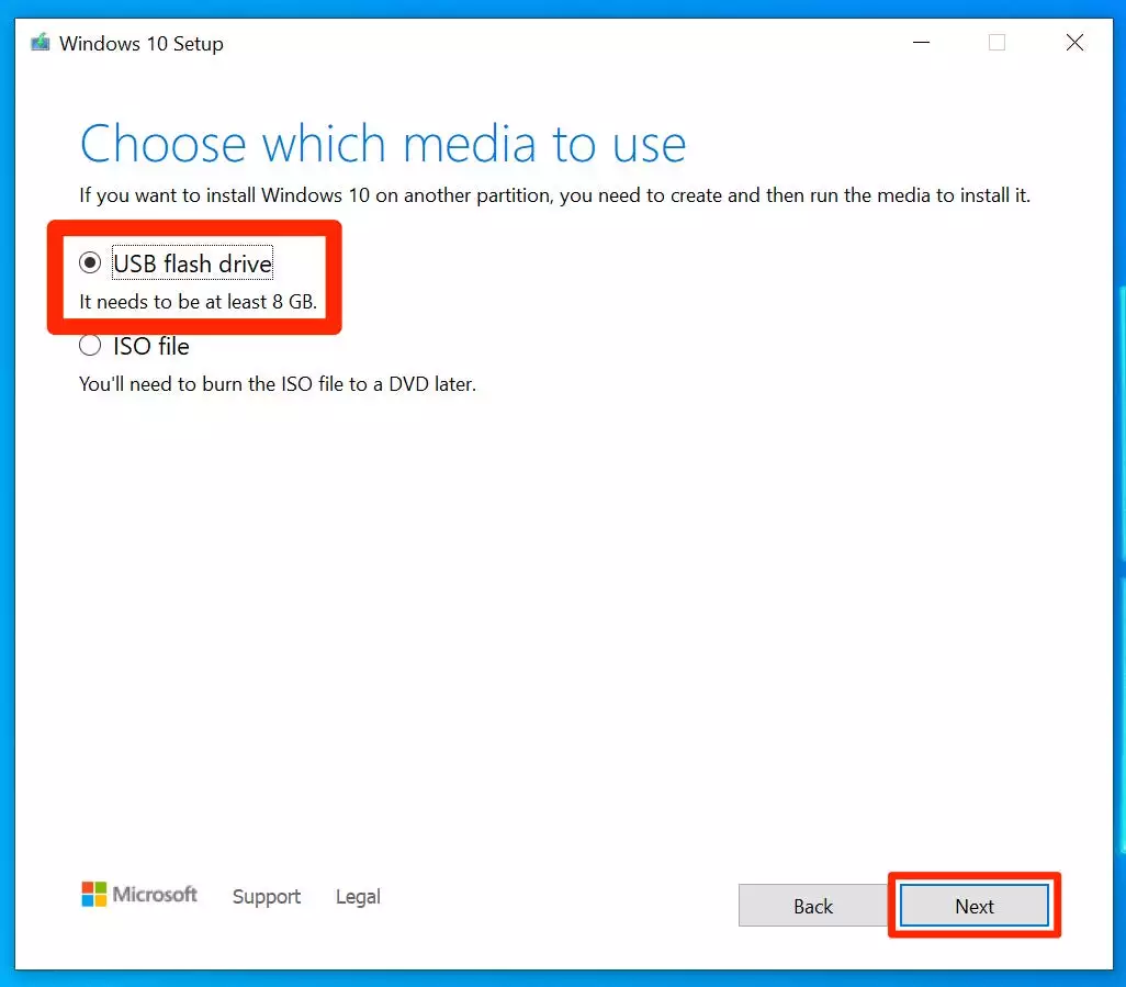 6.在“选择使用哪种媒体”页面上,选择将图像刻录到“ USB闪存驱动器”。点击下一步。”
