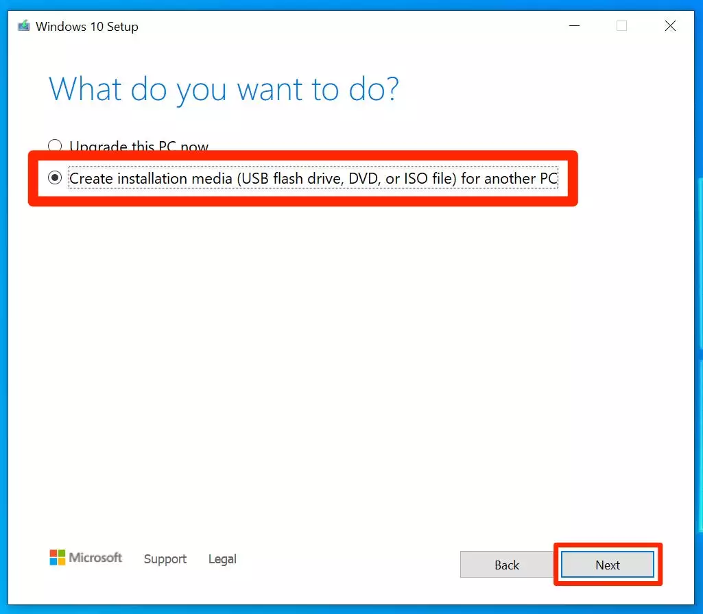 3.软件下载到您的计算机后,运行它并接受许可协议。 4.在“您要做什么”页面上,单击“为另一台PC创建安装媒体”,然后单击“下一步”(除非您计划在同一台计算机上重新安装Windows)。