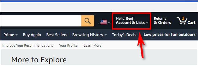 要在台式机浏览器中的Windows,Linux或Mac上(在所有设备和浏览器上)到处(在所有设备和浏览器上)禁用“一键订购”,首先,在您喜欢的浏览器中打开Amazon.com。在亚马逊网站的顶部工具栏中,单击您名字下方的“ Account&Lists”。