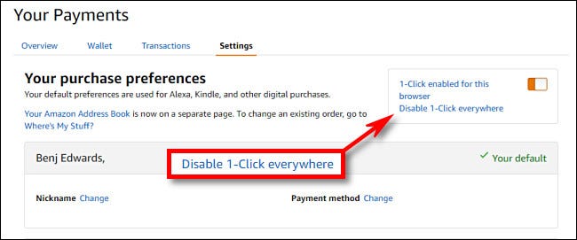 您刚刚单击的链接是“您的帐户”>“付款”>“设置”>“您的购买首选项”页面的快捷方式。在此页面上,单击位于页面右上角附近的框中的“禁用1-Click到处”链接。