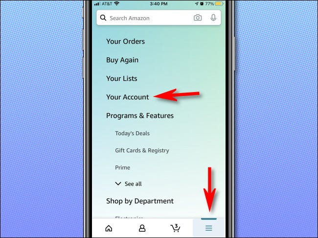 (或者,您可以在移动设备浏览器中访问Amazon.com。加载后,单击左上角的菜单按钮,然后向下滚动并选择“帐户”。从这里开始,说明是相同的适用于亚马逊的移动网站和亚马逊应用程序。)