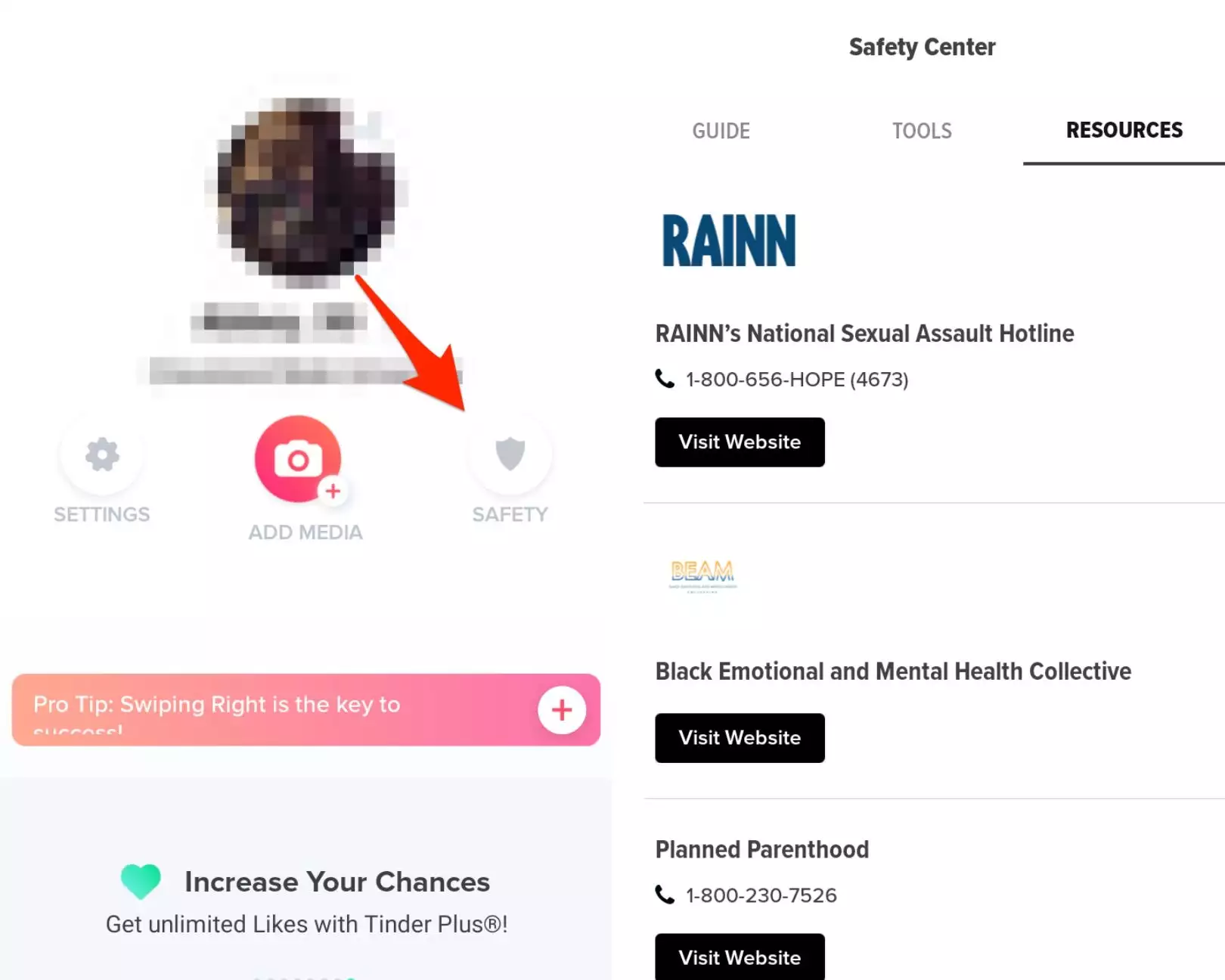如果您正在寻求支持,资源部分为 Tinder 社区的各个成员提供了大量热线电话号码。其中包括 RAINN 的全国性侵犯热线、全国家庭暴力热线、黑人情绪和心理健康集体、跨性别生命线、LGBT 全国帮助中心、计划生育和危机文本热线。