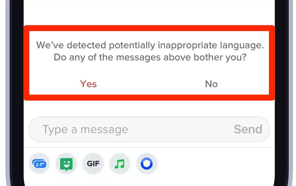 在人工智能和机器学习的帮助下,Tinder 将筛选和标记他们认为不合适的消息。Tinder 会提示用户输入被标记的消息,询问“这是否困扰你?” 如果您的回答是肯定的,您就可以举报该用户。