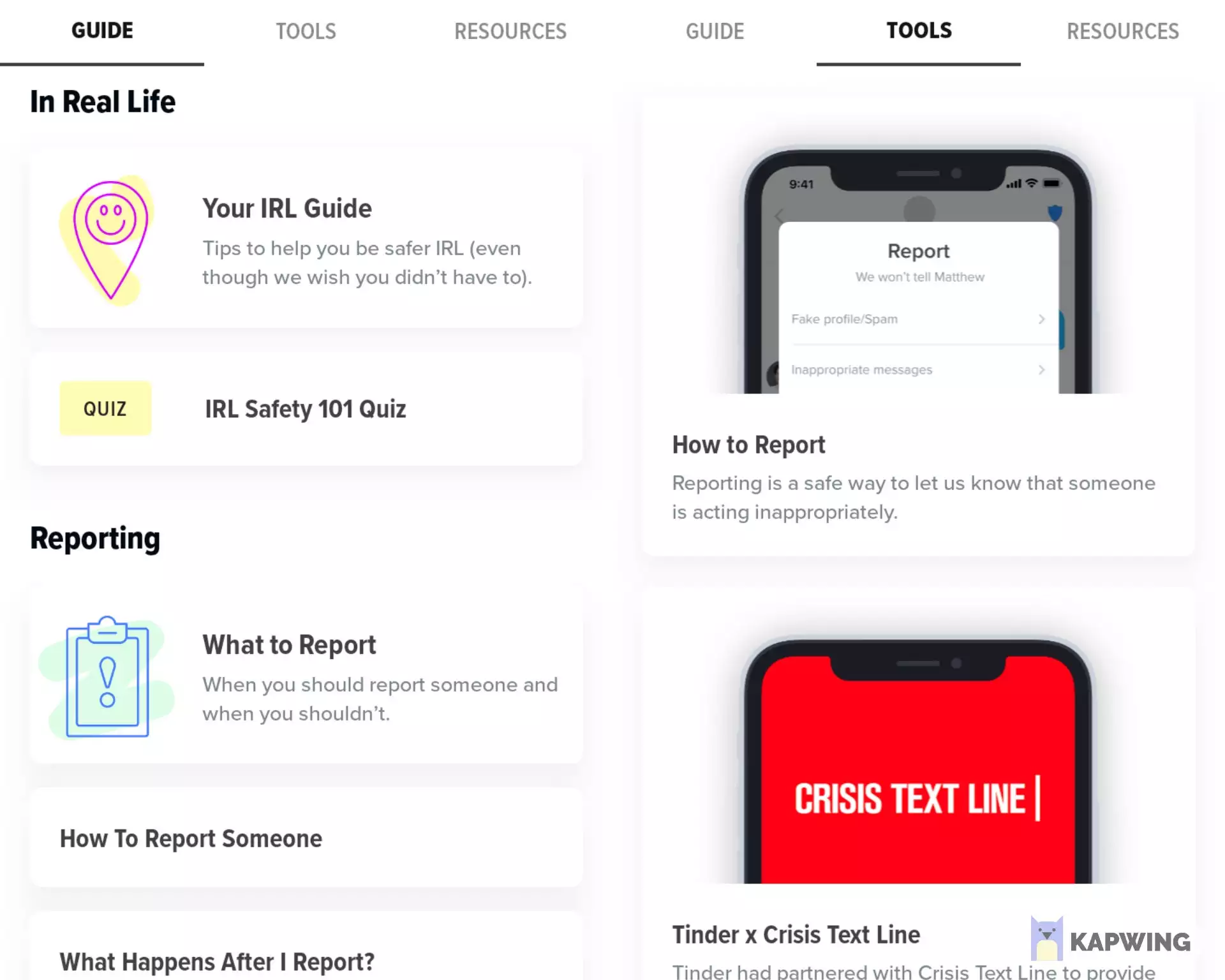 在“工具”选项卡下,选项不仅仅是让您做好安全准备,而是专注于如何帮助您应对事件或在应用程序和现实生活中保护自己。这包括如何报告个人资料、照片验证、隐私设置、无法匹配以及危机文本行。