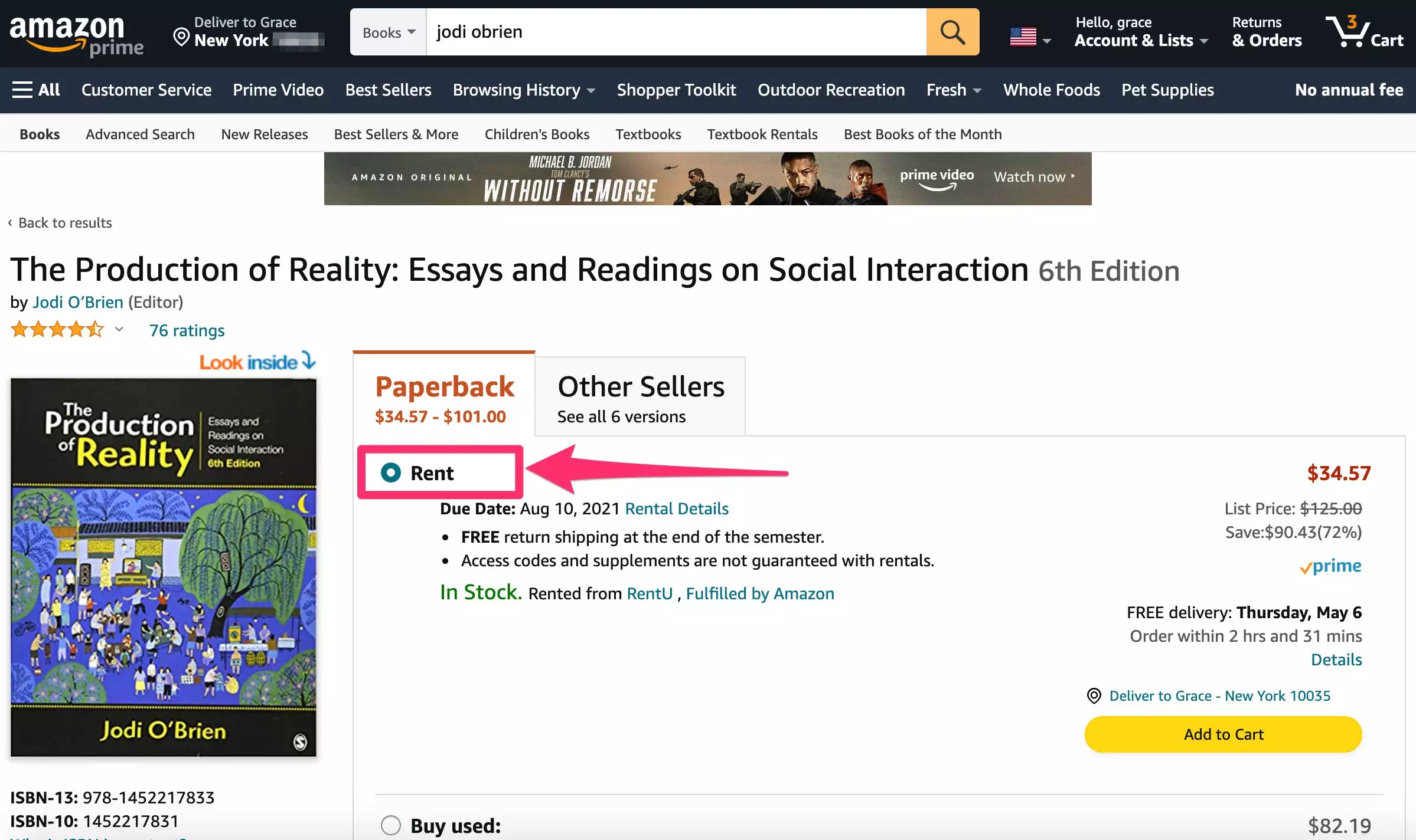 3.从搜索结果页面中查找并选择一本书。在产品详细信息页面上,单击圆形“租赁”按钮(如果尚未选择)。