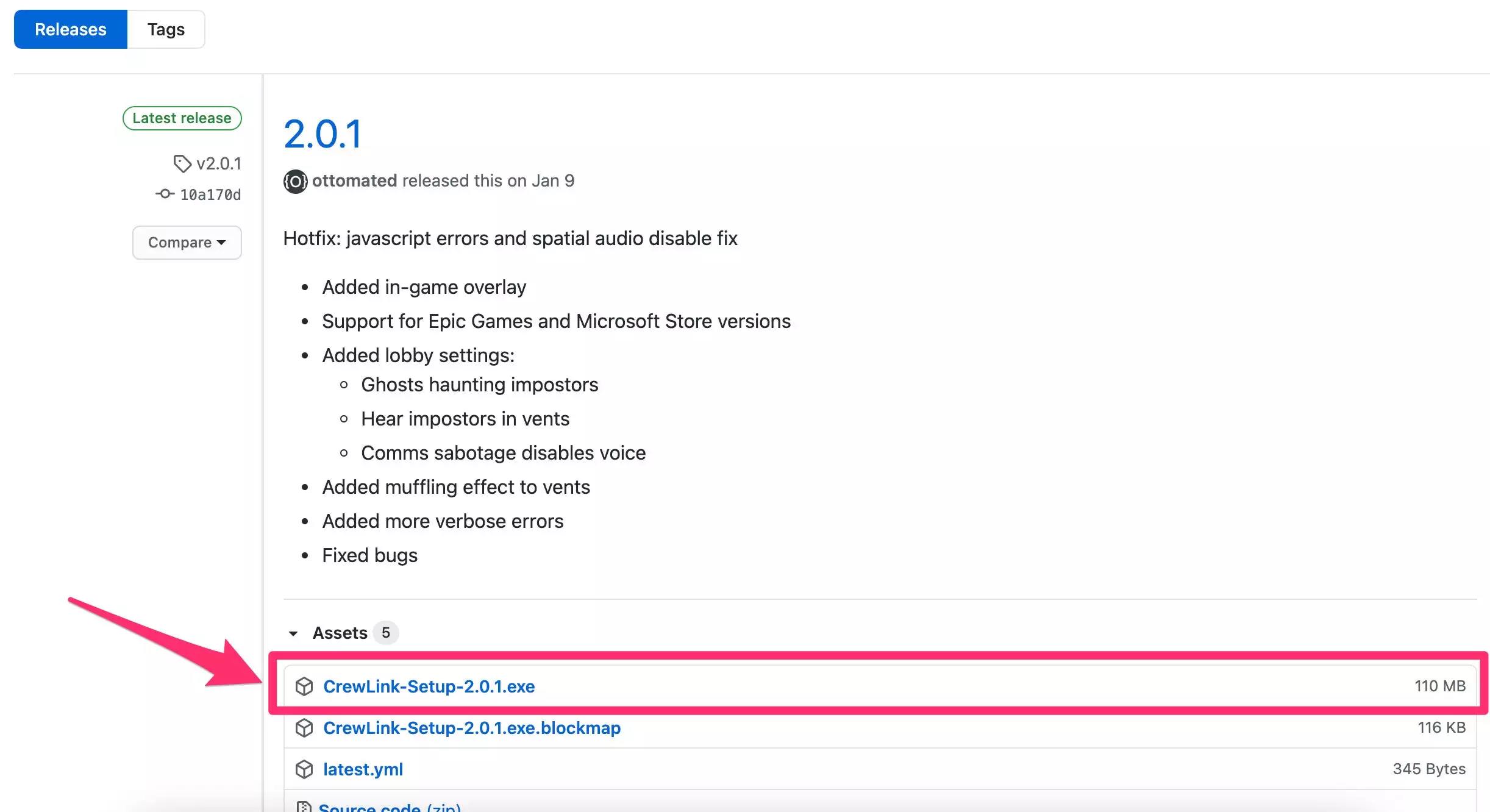 您需要从 GitHub 下载最新版本的 CrewLink。为此,请转到mod 页面的“安装说明”部分,然后单击“发布”。最新版本将出现在页面顶部。然后,在“资产”下,单击第一个链接(它应该是 .exe 文件),下载将开始。