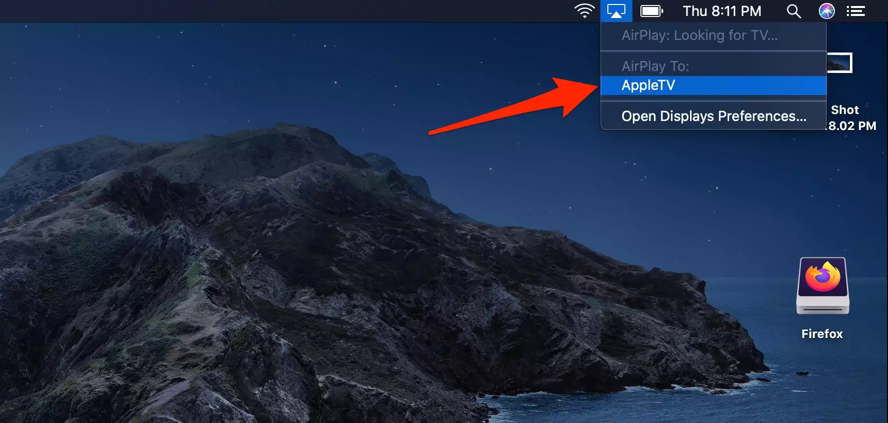 2.向下滚动以找到您的 Apple TV。您的 Mac 应该可以看到范围内的所有 AirPlay 设备,包括您的 Apple TV。点击“苹果电视”。