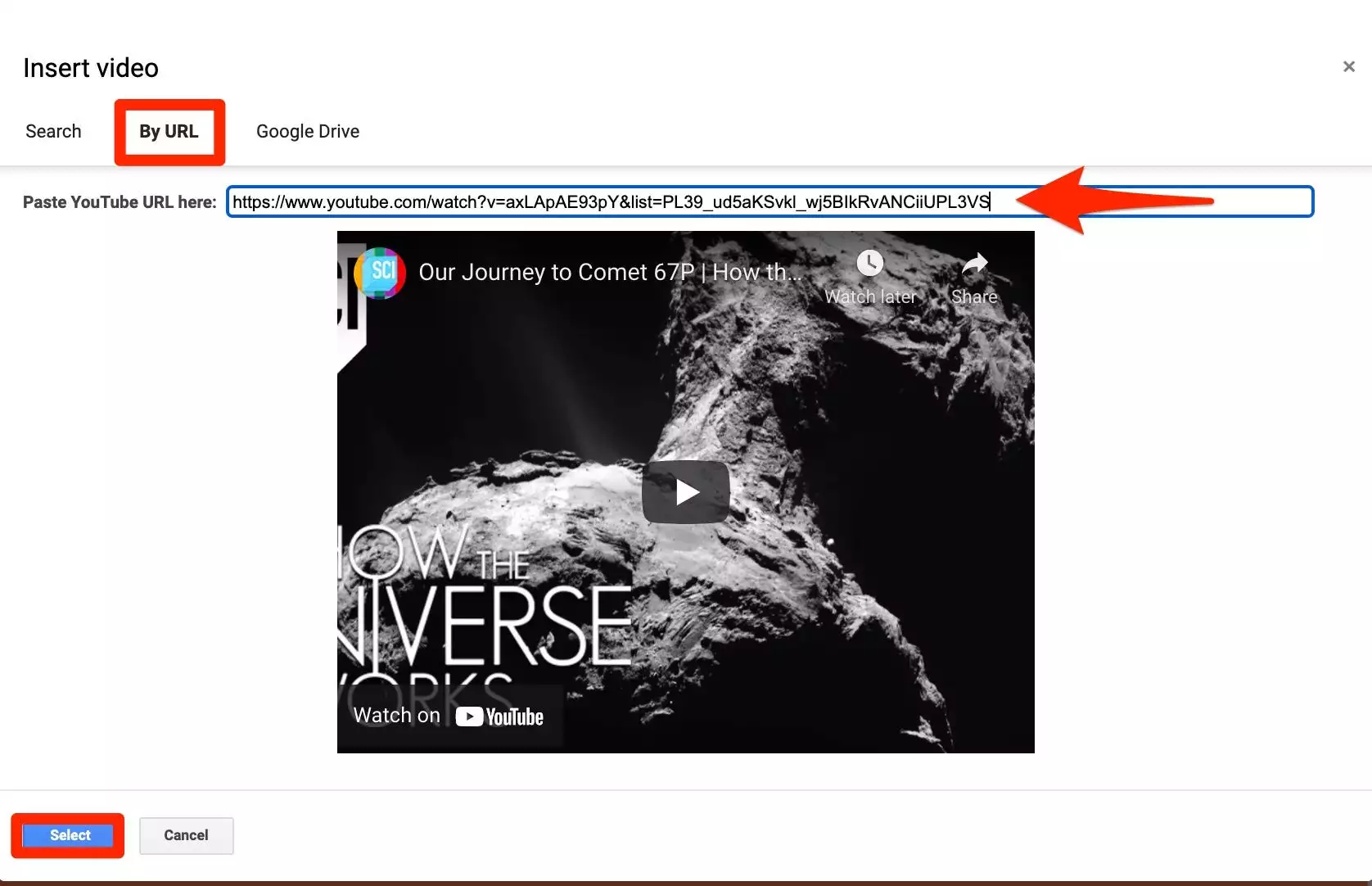 5. 如果您想使用 URL 将 YouTube 视频添加到 Google 幻灯片,则在出现插入视频窗口时,单击“按 URL”选项卡。
