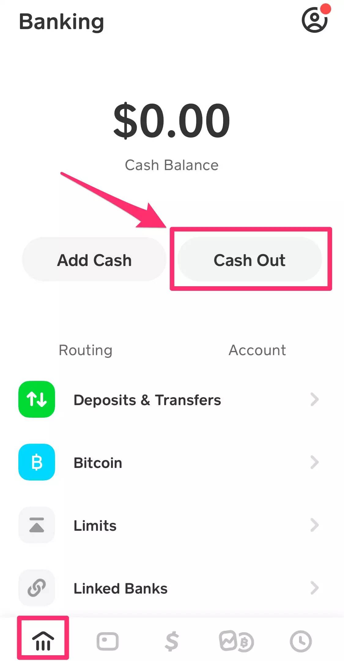 2.如果您的帐户中有任何资金,请务必先将其转入您的银行,然后再继续。为此,请点击左下角的银行图标(看起来像房子或银行),然后点击兑现。如果你有任何股票或比特币,你需要在关闭账户之前将它们卖掉。