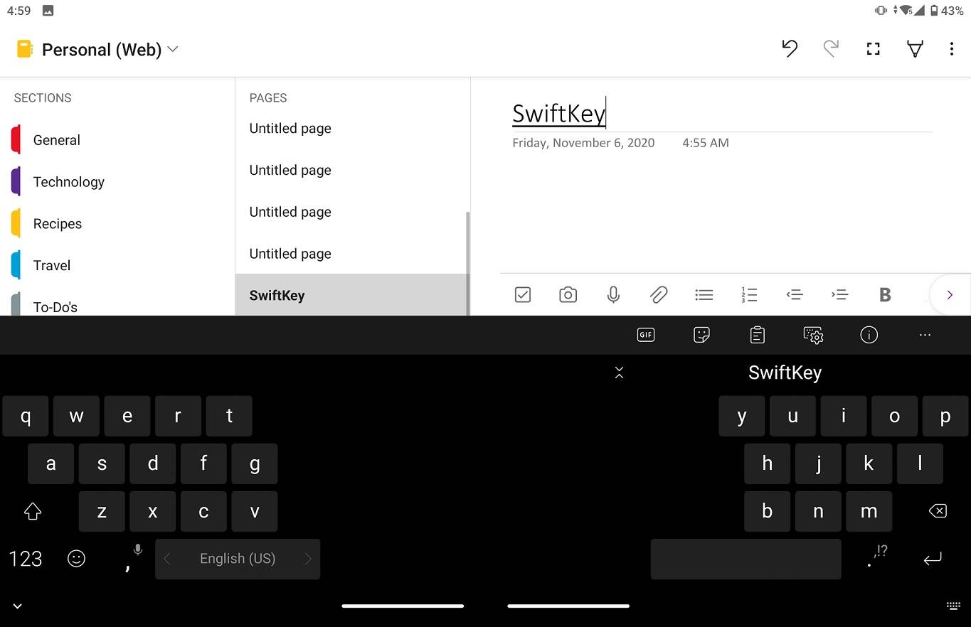 SwiftKey键盘带有触觉反馈,非常令人满意。它也可以单手使用,但是在书本模式下使用Surface Duo时的体验不够好。