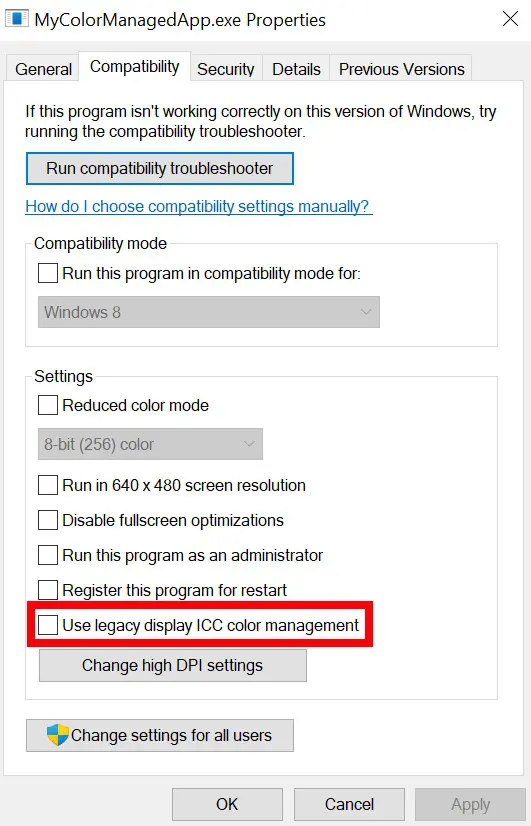 微软表示,用户可以访问此功能来选择在 Windows 上使用哪种颜色管理工具应用程序。这样做有点复杂,需要右键单击并转到应用程序属性和“兼容性”选项卡。在选项卡的“设置”部分,有一个标有“使用旧显示 ICC 颜色管理”的新选项。