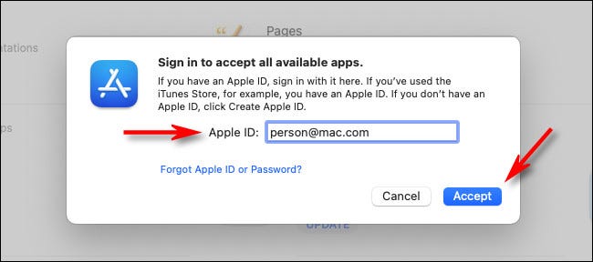 接下来,输入您的 Apple 帐户 ID 和密码,然后单击“接受”。