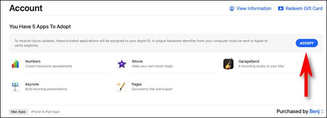 在您的帐户屏幕上,您将看到您过去购买的Mac 应用程序列表。如果有应用程序可供采用,它们将列在靠近顶部的特殊部分中,标有“您有 X 个应用程序可供采用”,其中“X”是等待采用的应用程序数量。单击“接受”按钮。