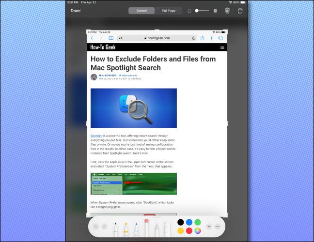 如果您点击缩略图,您将进入编辑模式,您可以在其中向屏幕截图添加注释、裁剪等等。
