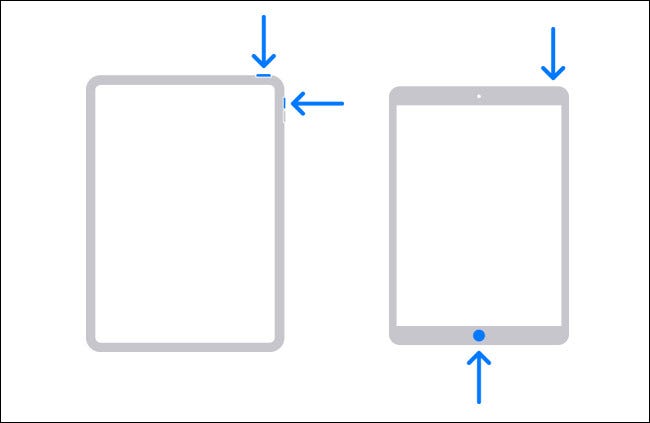 - 带有主页按钮的 iPad:同时短暂按住顶部按钮和主页按钮。