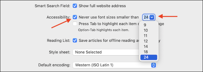 如果您稍后改变主意并希望恢复较小的字体大小,请单击菜单栏中的“Safari”并导航至“首选项”>“高级”,然后取消选中“从不使用小于以下的字体大小”选项。或者,您可以简单地从菜单中选择较小的字体大小。
