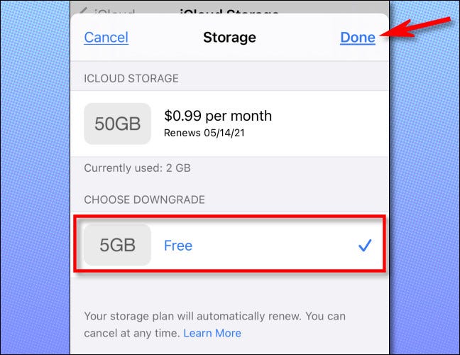 如有必要,请使用您的 Apple ID 密码登录。然后,在“存储”屏幕上,查找底部的“选择降级”部分。从列表中选择“免费”选项,然后点击“完成”。