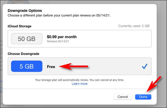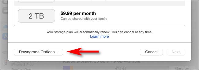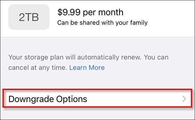 注意:如果您拥有 Apple One 帐户,则不会看到“降级选项”。您需要先取消它并让它完全失效,然后您的存储空间将自动降级到免费层。