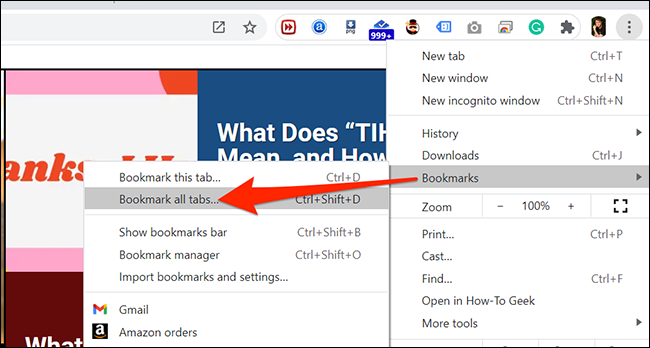 首先,请在 Windows、Linux 或 Mac 上打开 Chrome。然后,打开要复制其地址的站点。打开多个站点后,单击 Chrome 窗口右上角的菜单按钮(三个点),然后选择书签 > 为所有标签添加书签。