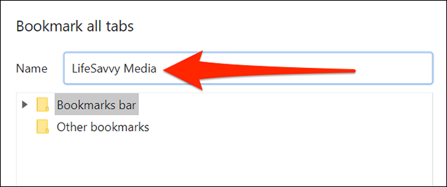 在出现的“书签所有标签”窗口中,在顶部输入新书签文件夹的名称。然后,点击底部的“保存”。