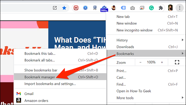 接下来,通过单击浏览器窗口右上角的 Chrome 菜单(三个点)并选择书签 > 书签管理器来打开 Chrome 的书签管理器。