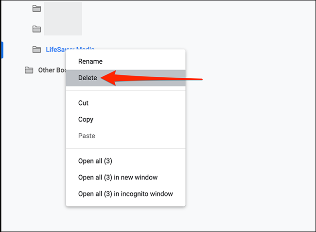 在书签管理器窗口的左侧边栏上,右键单击您之前创建的书签文件夹,然后从菜单中选择“删除”。