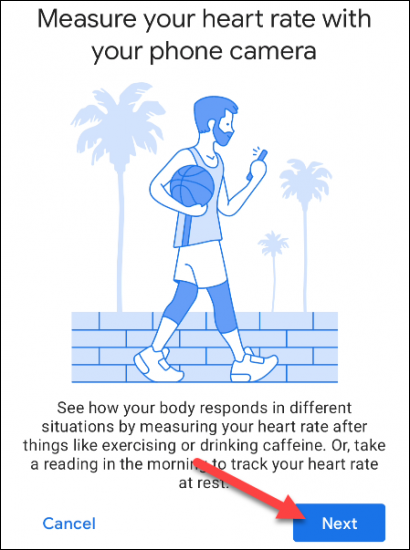 接下来,屏幕将说明您将使用手机的摄像头来测量您的心率。点击“下一步”继续。